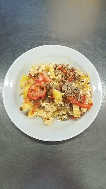 Zapečené bramborové noky s vepřovým masem, pórkem, smetanou a sýrem