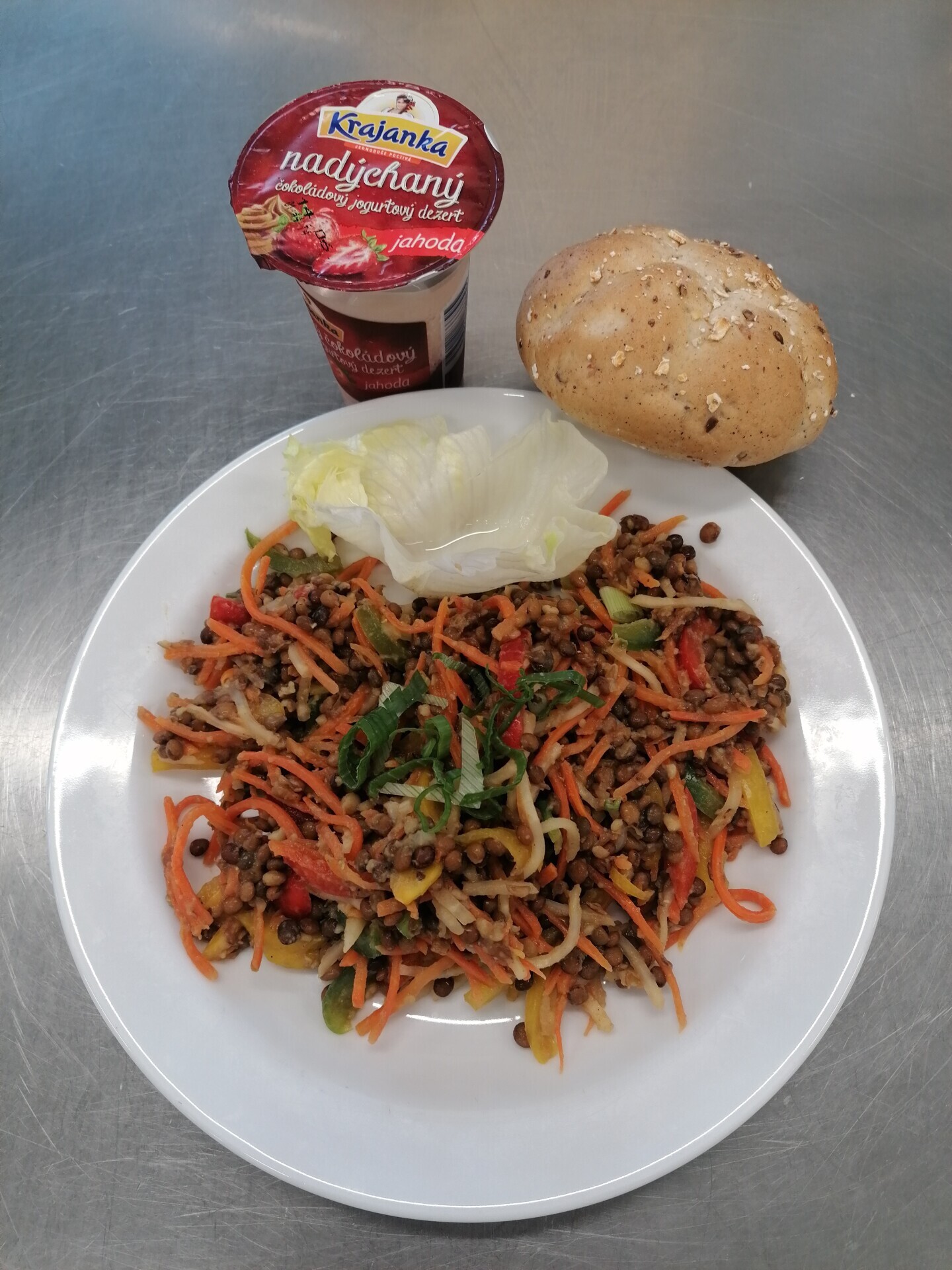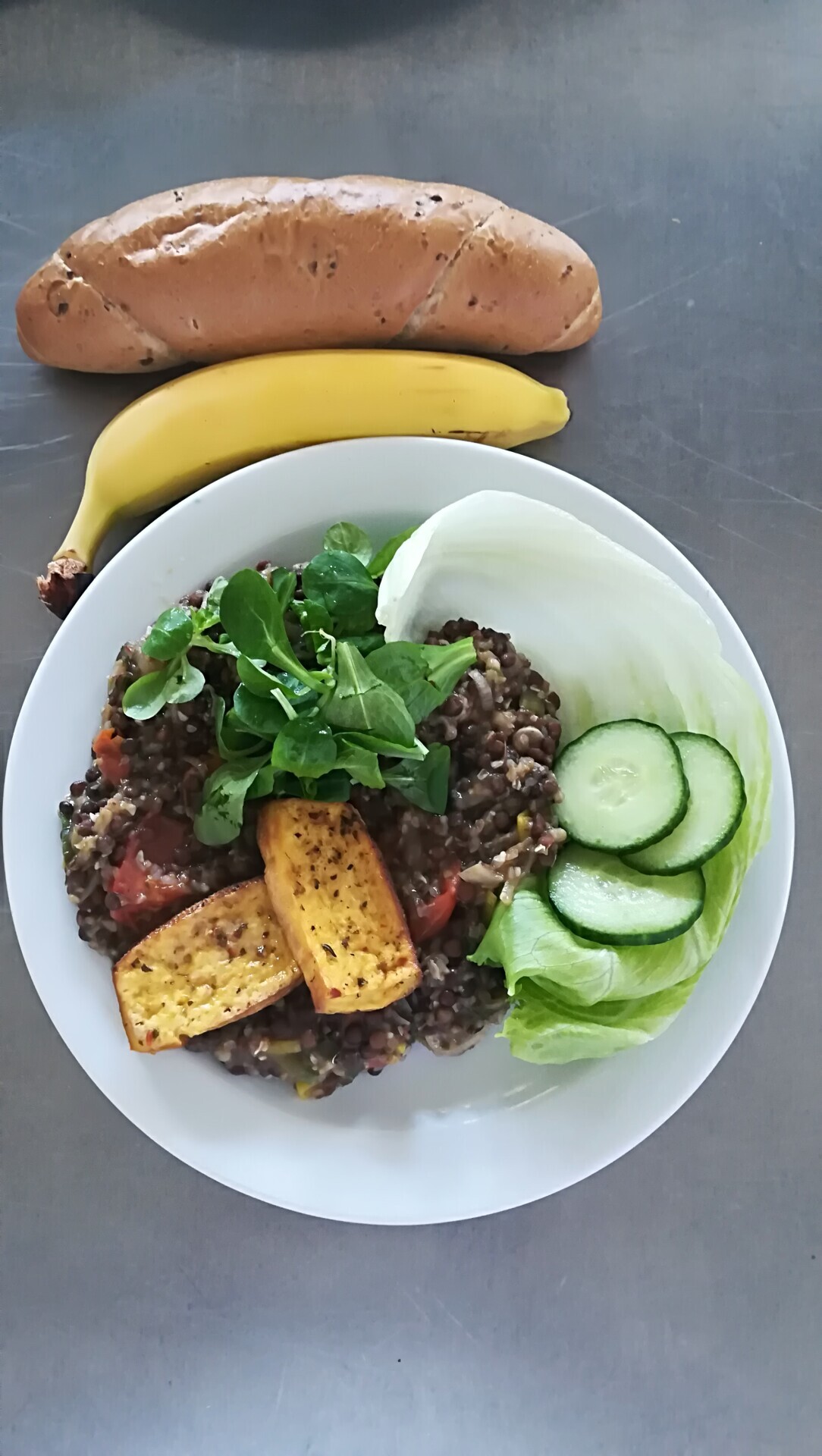Čočkový salát s pohankou a uzeným tofu, cereální pečivo