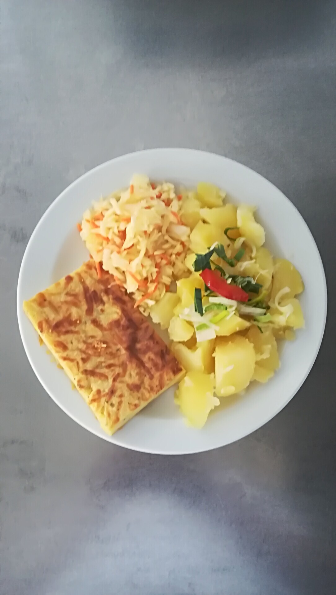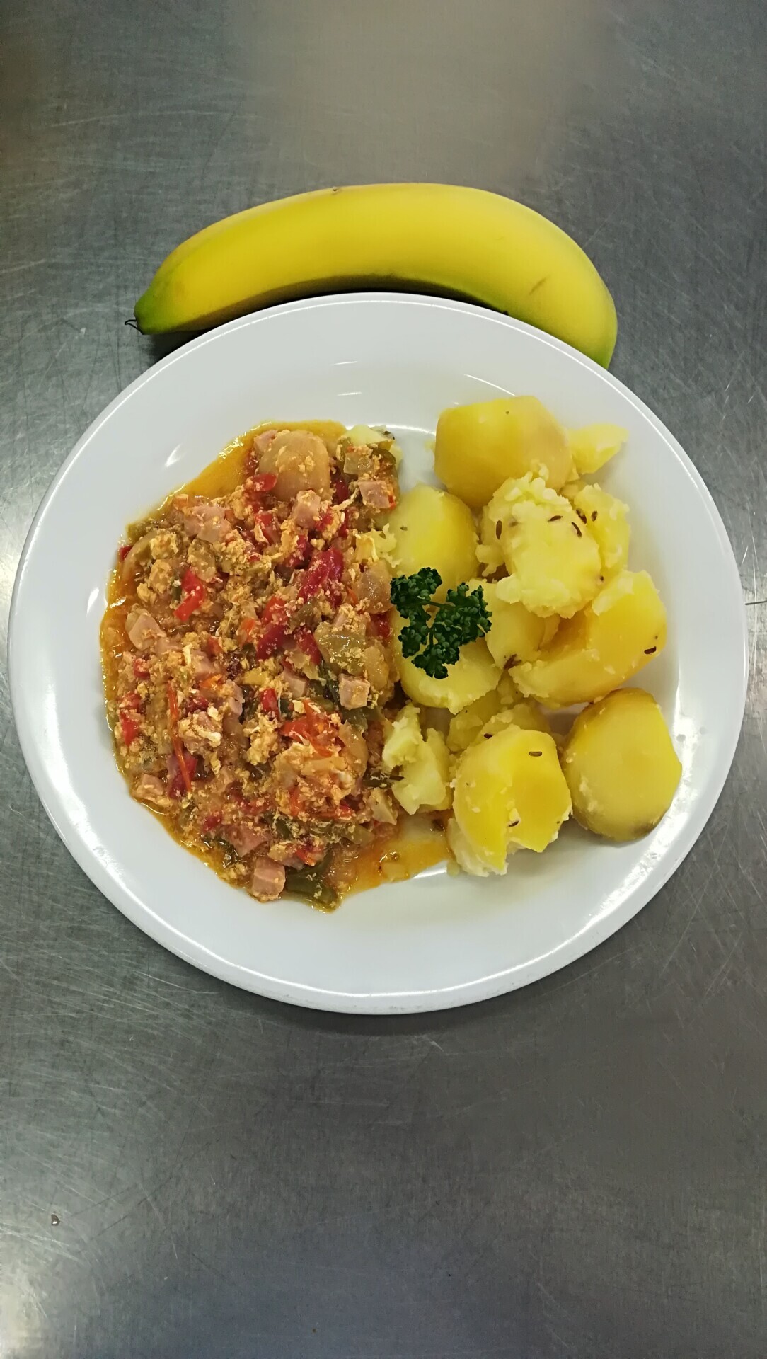 Zeleninové lečo se šunkou a vejci, vařený brambor