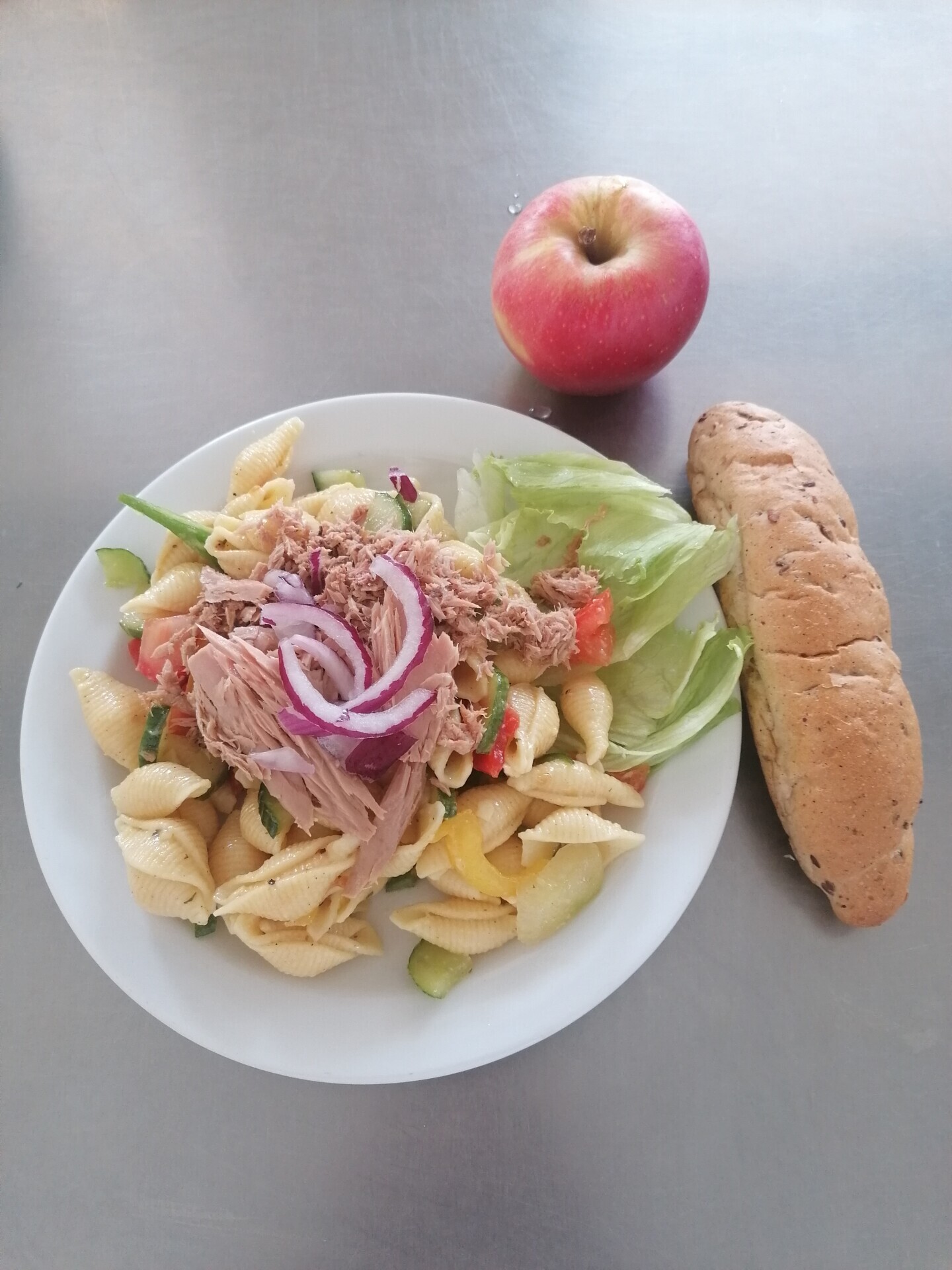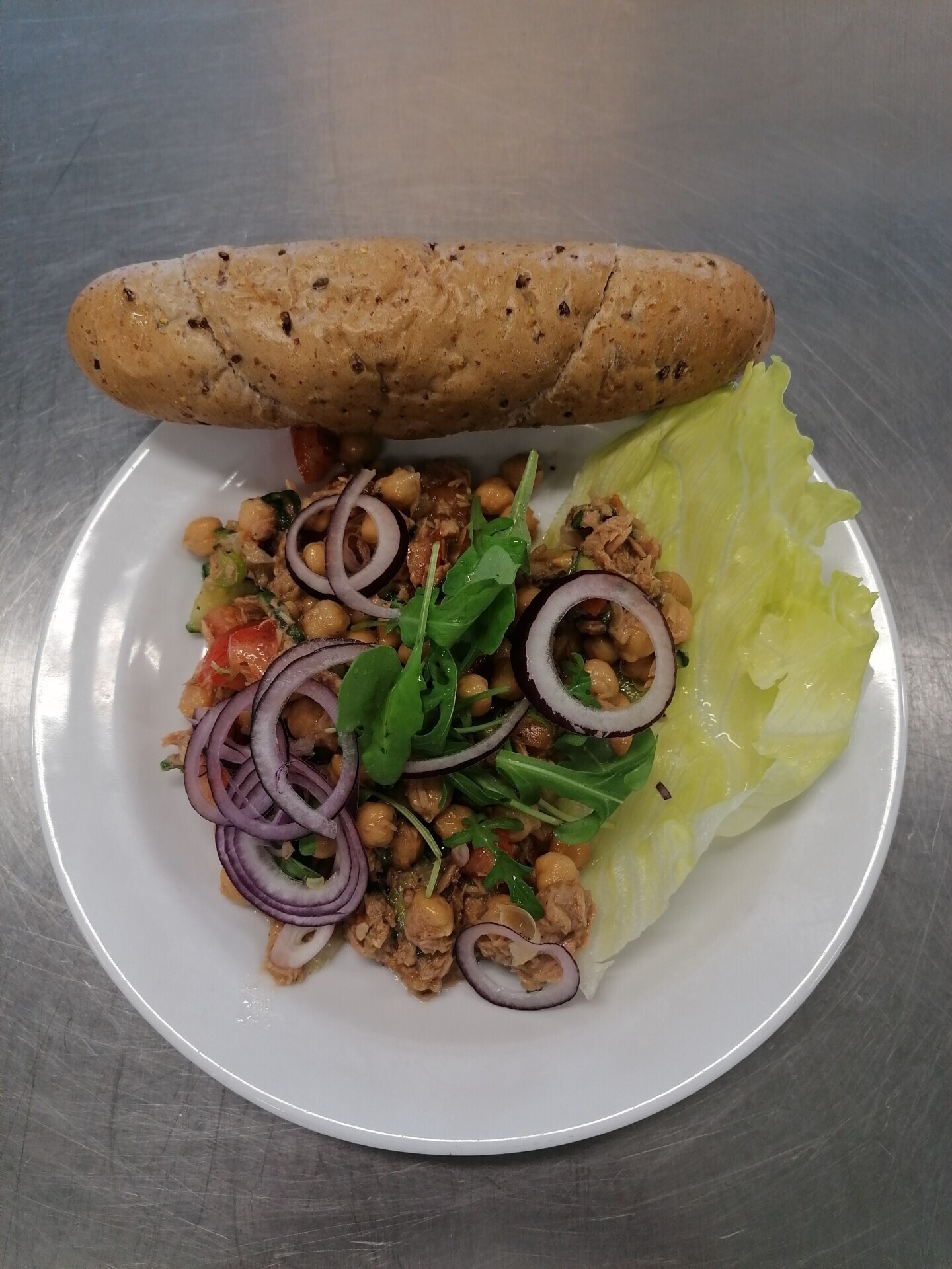 Cizrnový salát s tuňákem (+ rajče, okurka), pečivo