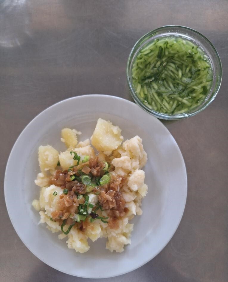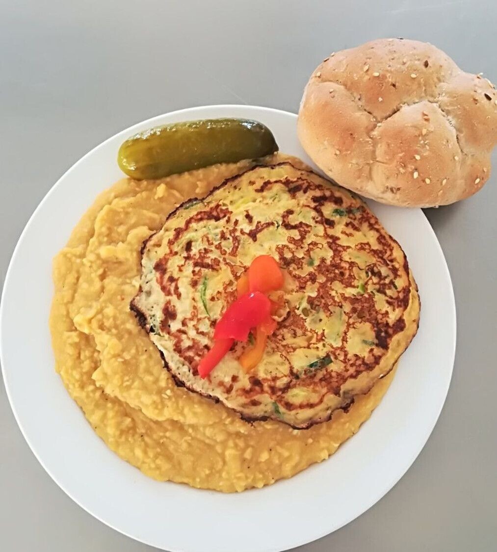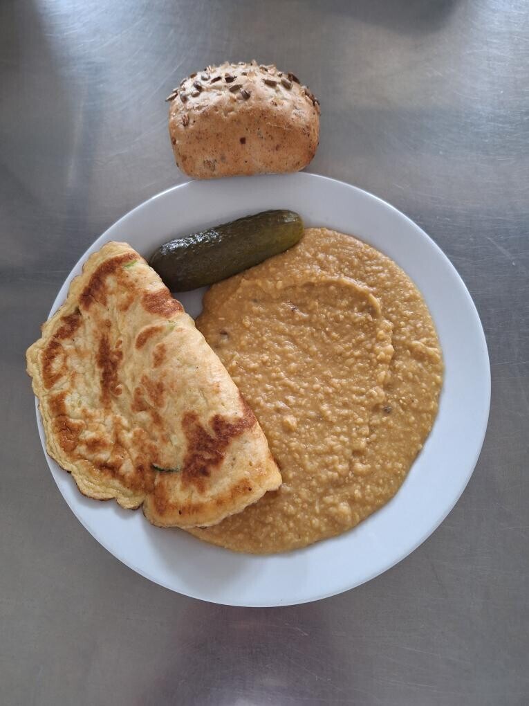 Cizrnová kaše, vaječná omeleta s pórkem, sterilovaná okurka, slunečnicová kostka