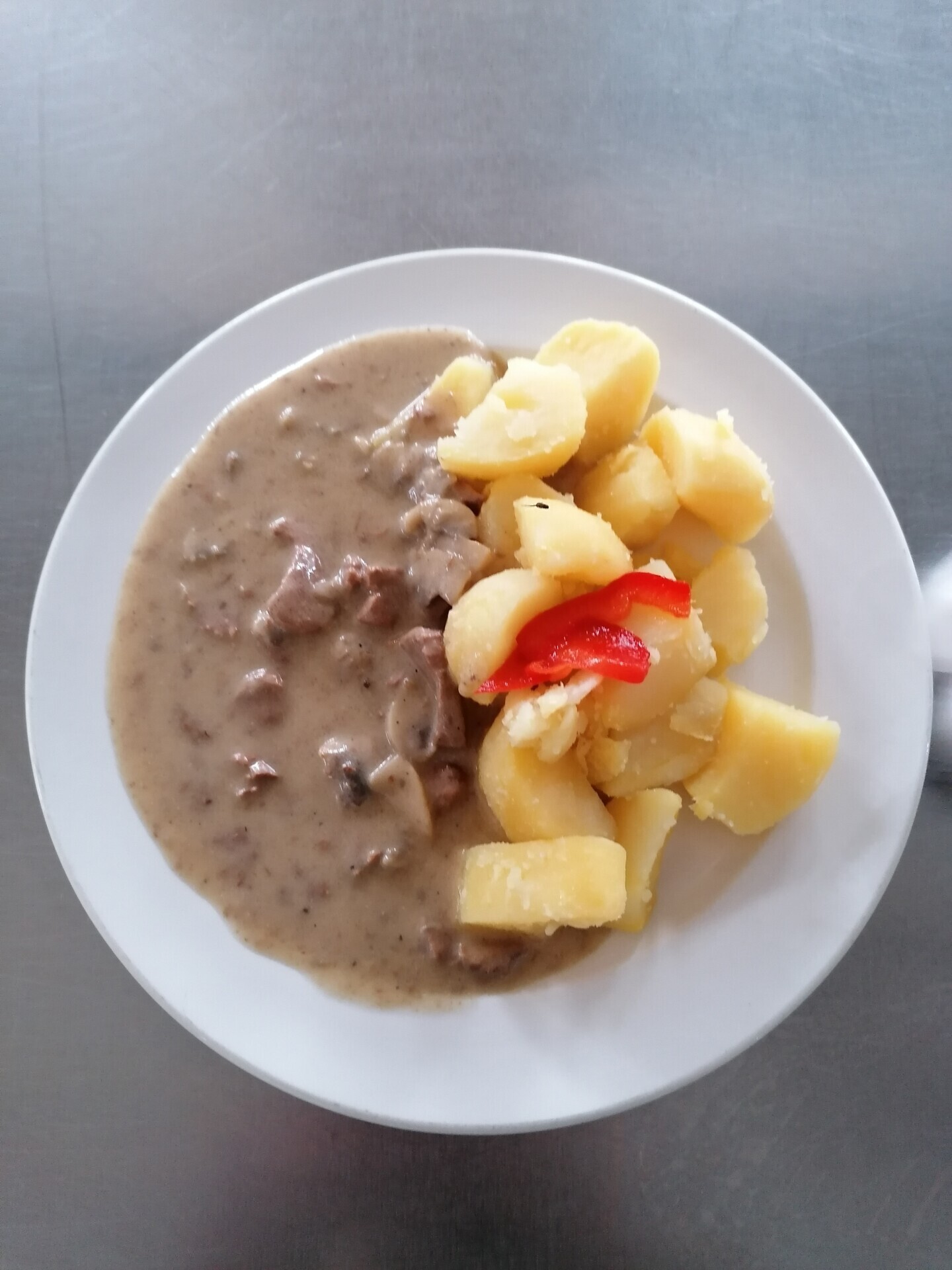 Zámecké srnčí nudličky (srnčí kýta, smetana, houby), vařený brambor