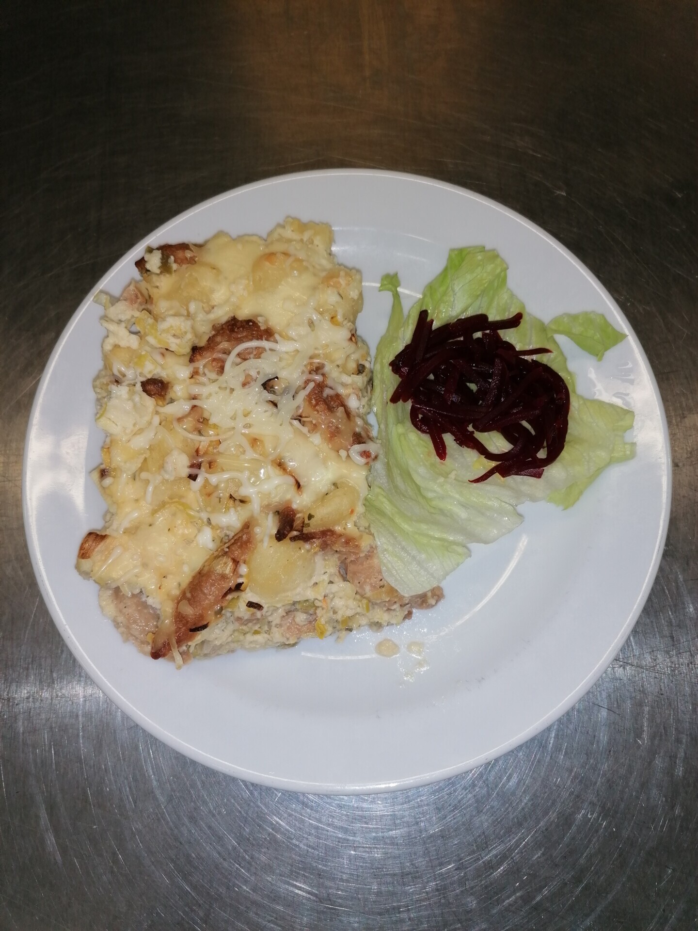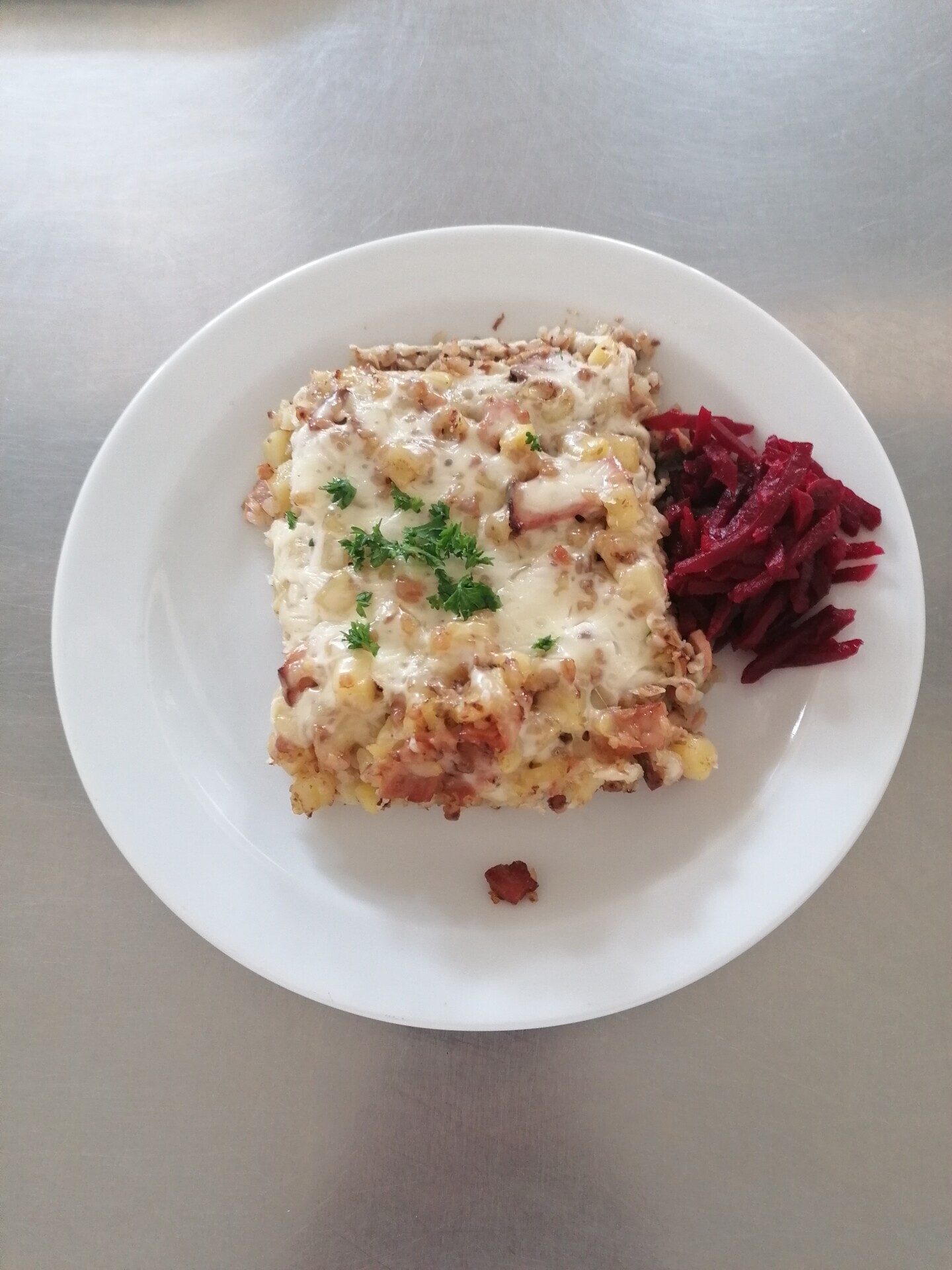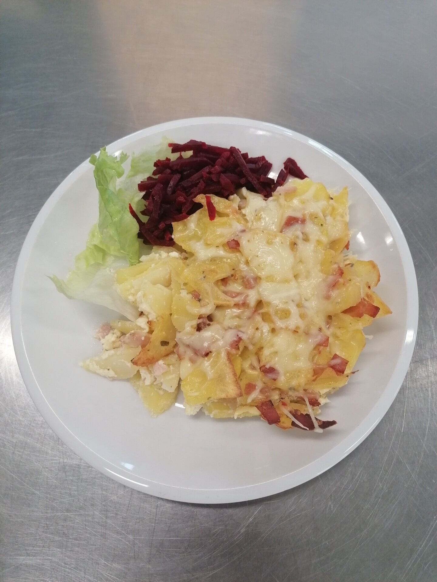 Zapečené brambory se šunkou a sýrem, červená řepa