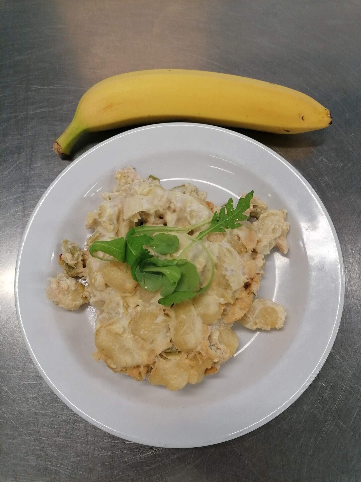 Zapečené bramborové noky s kuřecím masem, pórkem, smetanou a sýrem