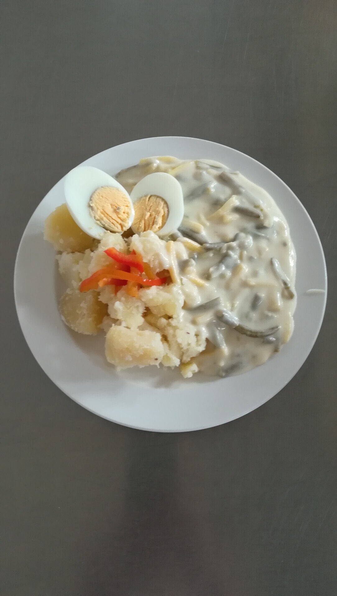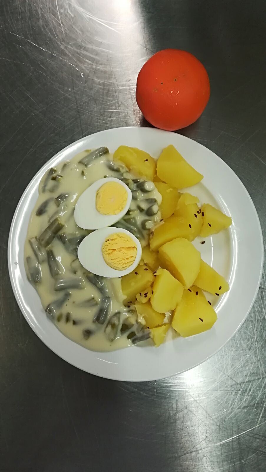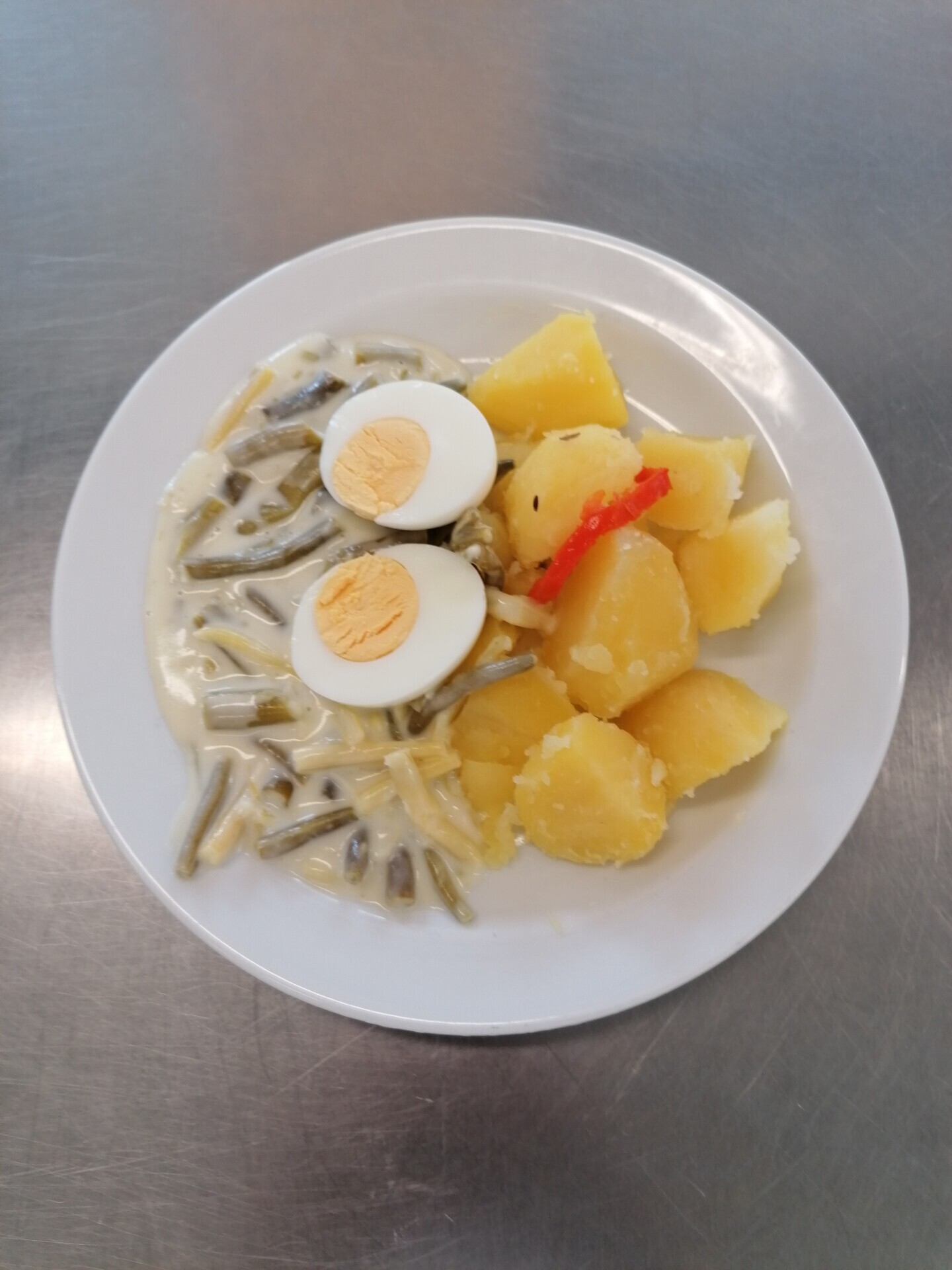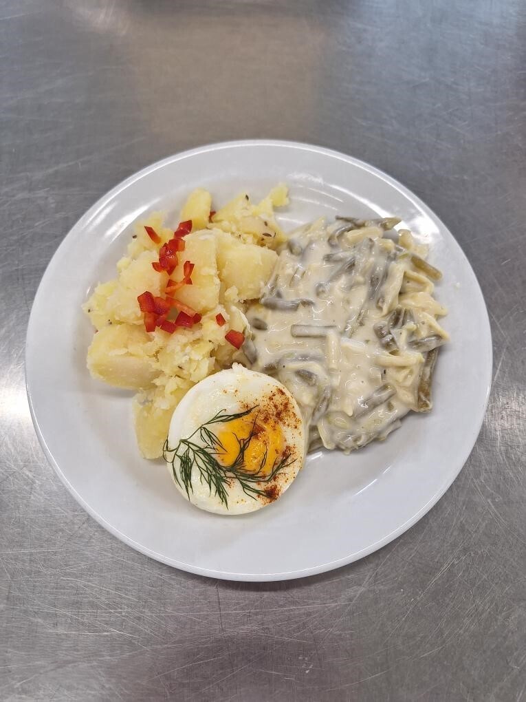 Duo fazolky na kyselo, vařené vejce, vařený brambor