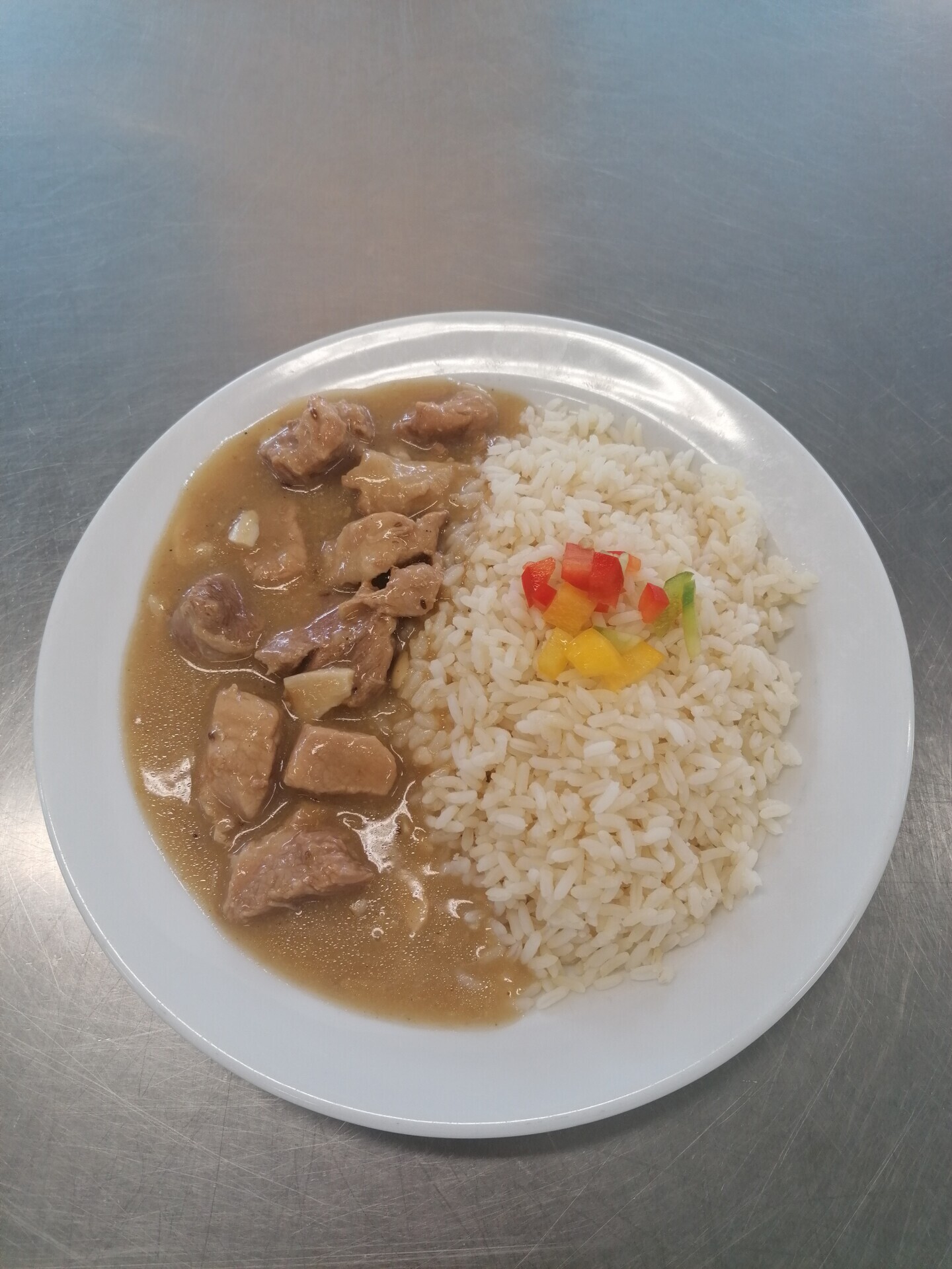 Vepřové kostky na česneku, dušená rýže