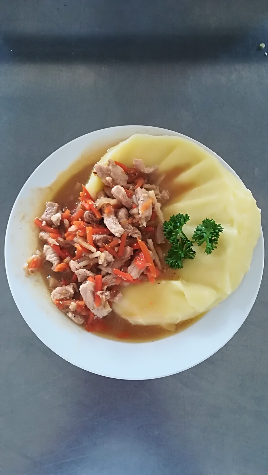 Vepřové nudličky na zelenině (mrkev, celer), bramborová kaše