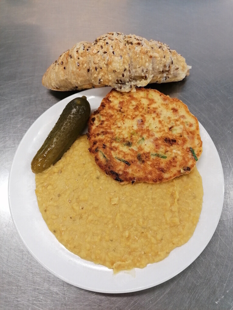 Cizrnová kaše, vaječná omeleta se šunkou, sýrem a pórkem, sterilovaná okurka, sýr. croissant