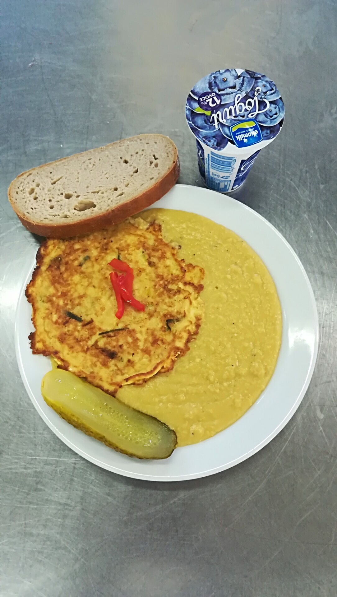 Cizrnová kaše, vaječná omeleta se sýrem, sterilovaná okurka, chléb