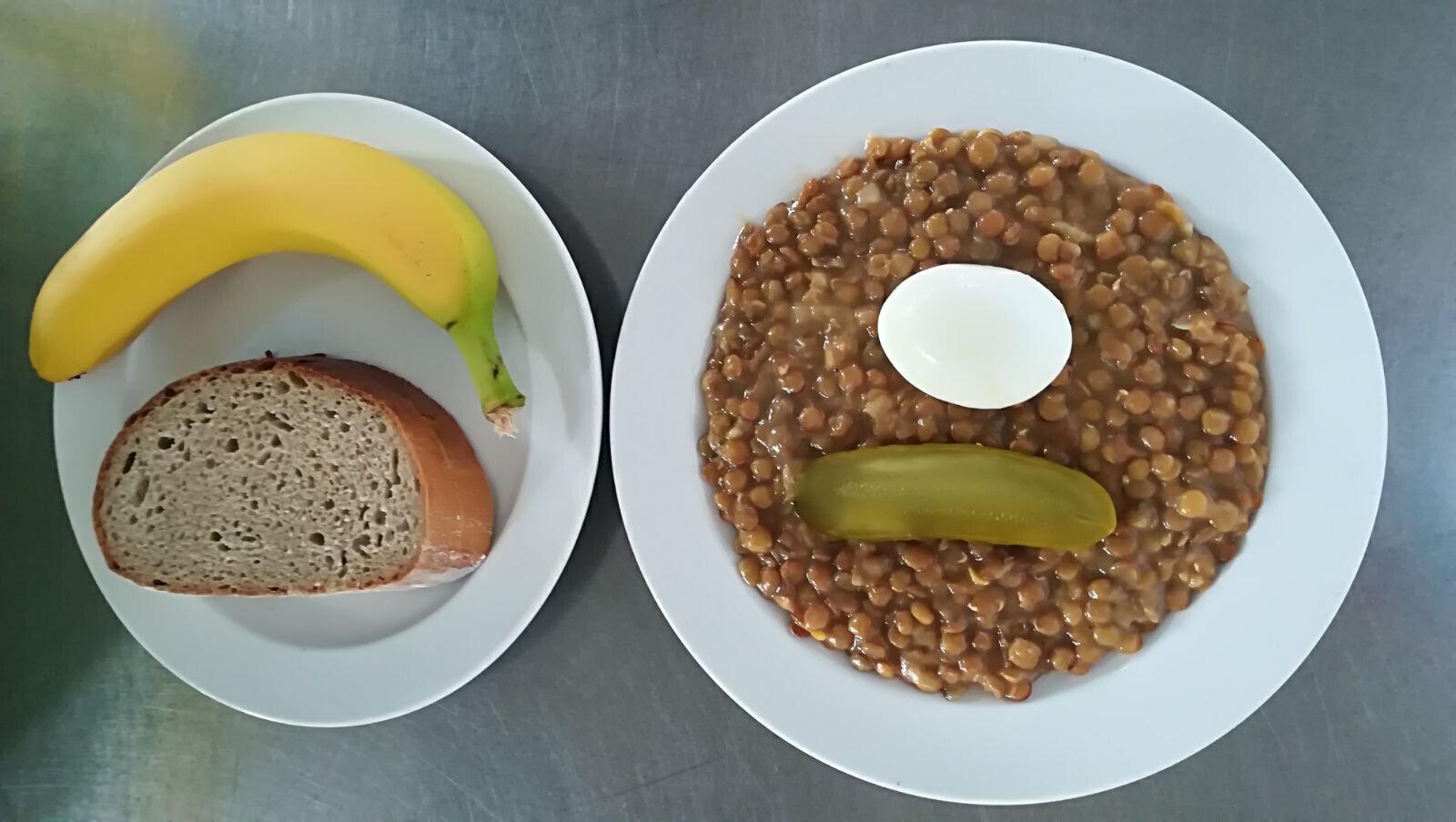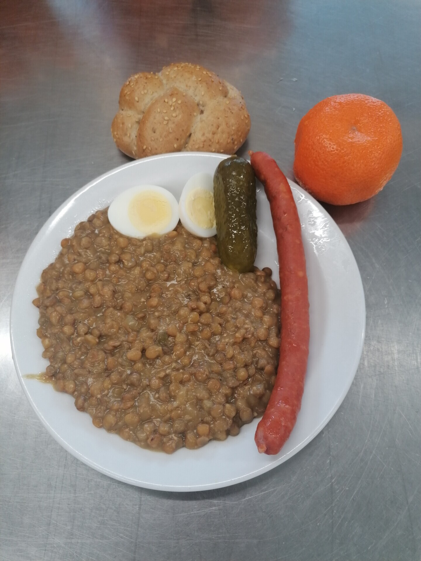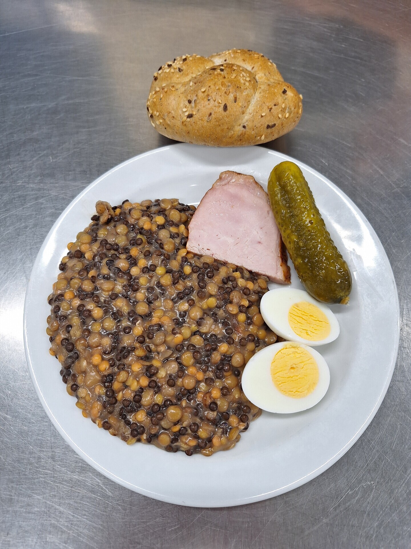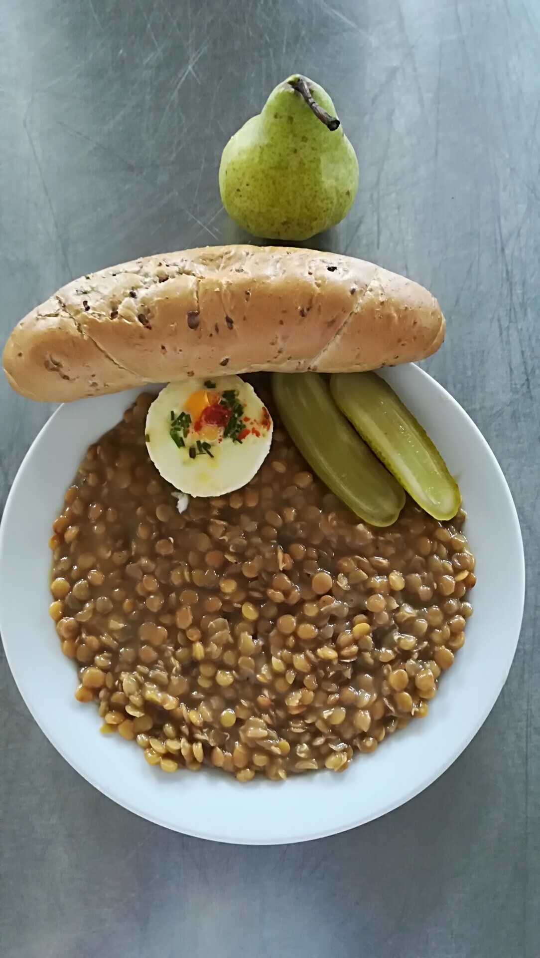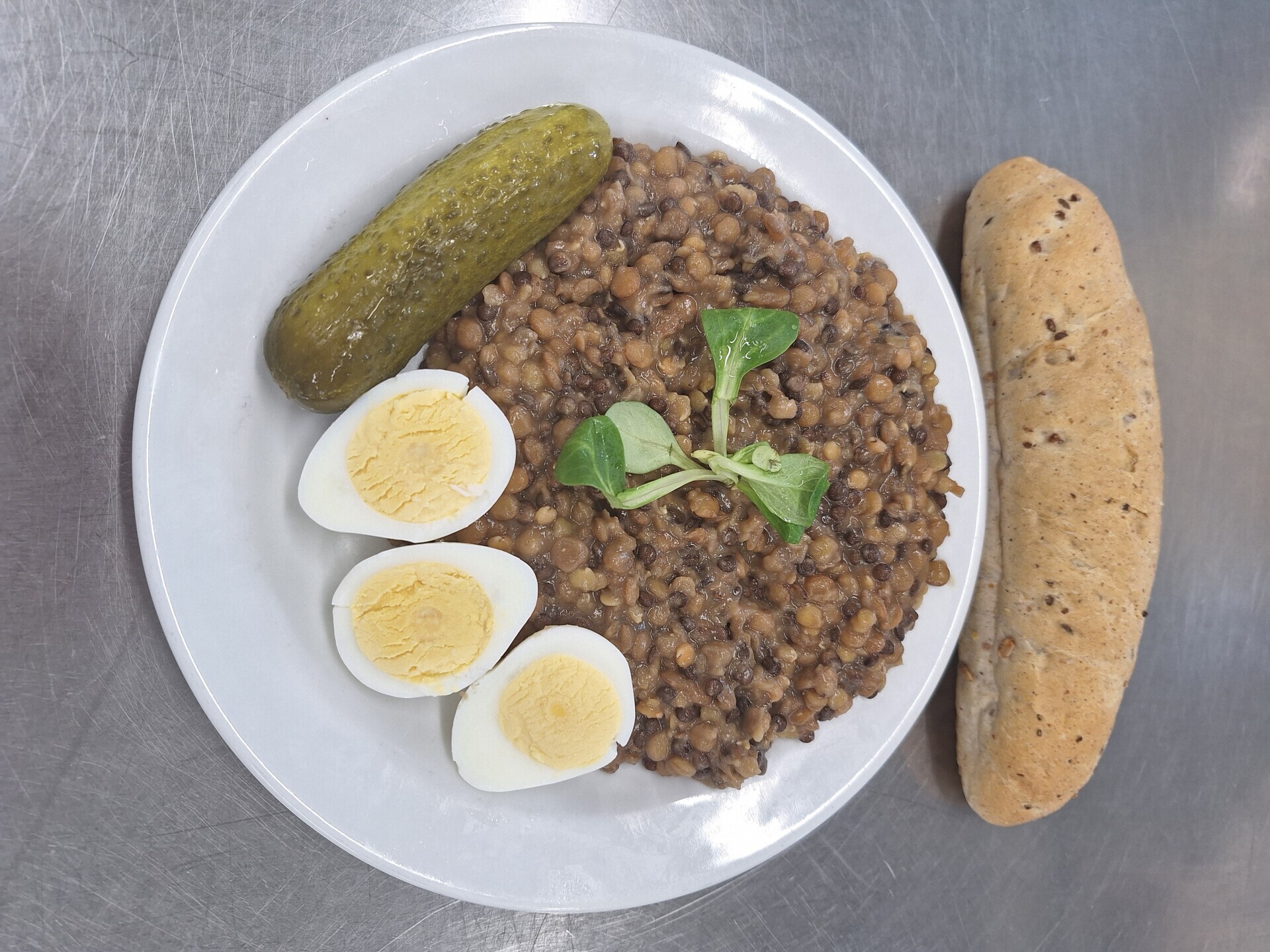 Čočka na kyselo, vařené vejce, sterilovaná okurka, pečivo