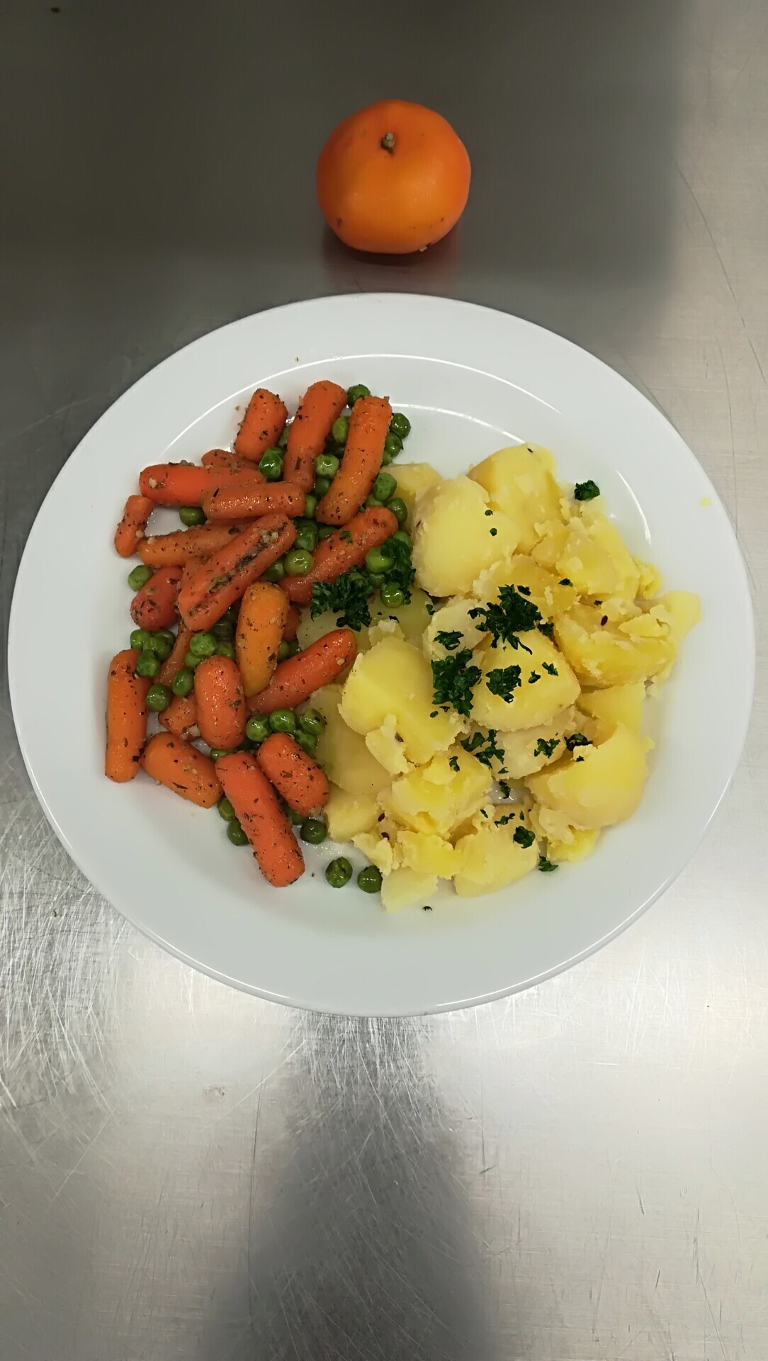 Dušená baby mrkev s hráškem na másle, vařený brambor